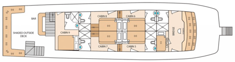El barco tiene nueve cabinas, todas con su baño privado, aire acondicionado, electricidad y todo lo necesario para una estancia cómoda. El camarote principal en la cubierta principal y los camarotes en la cubierta superior tienen ventanas que le permitirán disfrutar de los hermosos amaneceres y atardeceres de las Islas Galápagos. Las cabinas inferiores tienen portillas con vista al mar y luz natural.